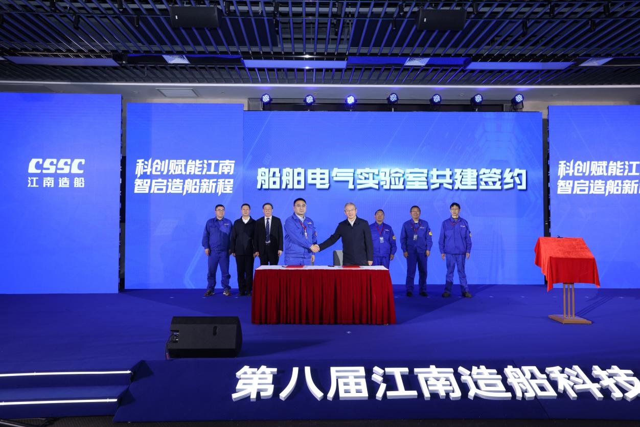 12月13日,在江南造船(集团)有限责任公司(以下简称江南造船集团)第八届科技创新大会暨科技创新论坛现场,学校与江南造船集团签署合作协议,共建船舶电气实验室(以下简称实验室)。此次签约仪式标志着双方校企协同创新迈入实质性落地阶段,将为船舶电气化、信息化、智能化技术突破注入强劲科研动能。